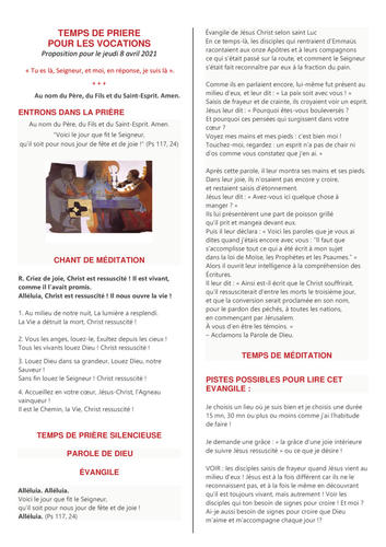 ECOUTER : les paroles de Jésus qui voit très bien ce qui se passe dans le cœur des disciples et dans notre cœur ! Alors n’hésitons pas à lui exprimer nos peurs, nos joies, nos inquiétudes… à Lui qui est ressuscité et qui nous invite à en être les témoins !