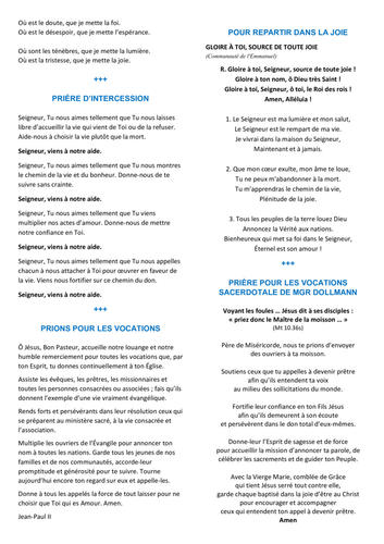 Assiste les évêques, les prêtres, les missionnaires et toutes les personnes consacrées ou associées; fais qu’ils donnent l’exemple d’une vie vraiment évangélique.