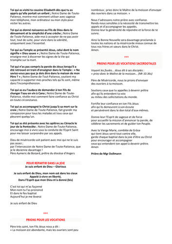 Toi qui au Temple as présenté Jésus, celui dont le nom signifie « Dieu sauve » ; Notre Dame de-Toute-Patience, enseigne-moi à discerner les signes de la Vie qui triomphe sur la mort.