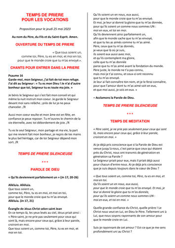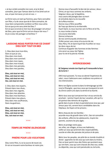 Seigneur, tu nous veux unis à toi, comme tu es uni au Père : Ouvre nos cœurs pour que cette amour soit au plus profond de nous, et que nous soyons témoin vivant de cet amour, signe de ta résurrection et de ta présence.