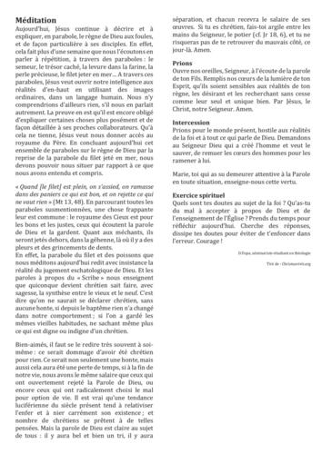 « Quand il est plein », Le Seigneur termine son discours sur le Royaume, il use de l’image du filet que l’on tire de la mer avec plein de poissons qui sont ensuite triés sur le rivage. Il manifeste ainsi le terme, la fin du monde, en évoquant pour son auditoire la finale du premier des psaumes, cette incapacité pour les injustes de se tenir au rassemblement des justes… Mais cette image évoque surtout la dimension autre du Royaume en ce monde, au-delà de notre vie courante mais qui donnera lieu à un jugement… Le Royaume en notre vie historique consiste seulement en une manière d’être, une attitude… Elle ne s’impose jamais comme une réalisation concrète, tangible mais elle colore toute l’existence des personnes et des peuples… Elle produit un fruit qui s’insère dans le quotidien des jours en les colorant… On ne peut l’isoler en tant que tel, mais au terme elle se révèle dans la manière qu’aura eue chacun de se tenir dans l’existence…