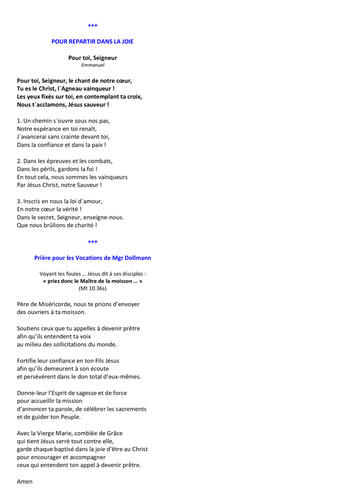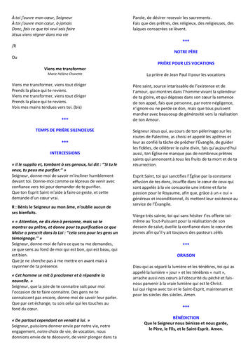 Seigneur Jésus qui, au cours de ton pèlerinage sur les routes de Palestine, as choisi et appelé les apôtres et leur as confié la tâche de prêcher l’Évangile, de guider les fidèles, de célébrer le culte divin, fais qu’aujourd’hui aussi, ton Église ne manque pas de nombreux prêtres saints qui annoncent à tous les fruits de ta mort et de ta résurrection.